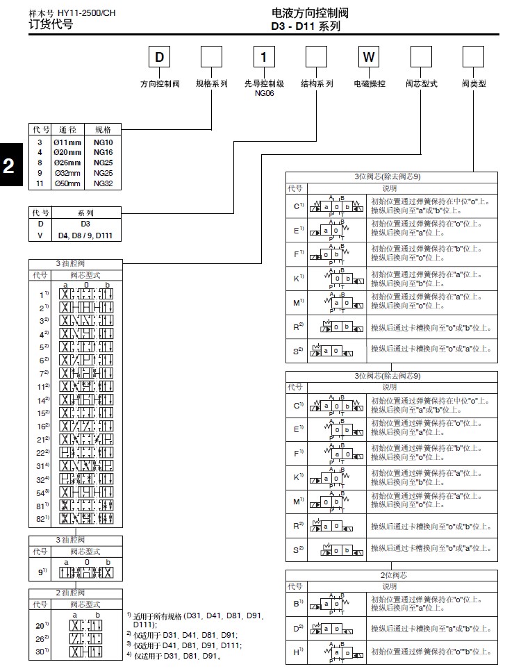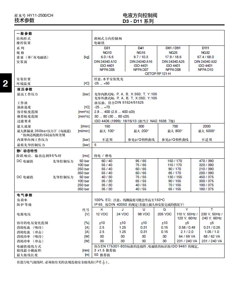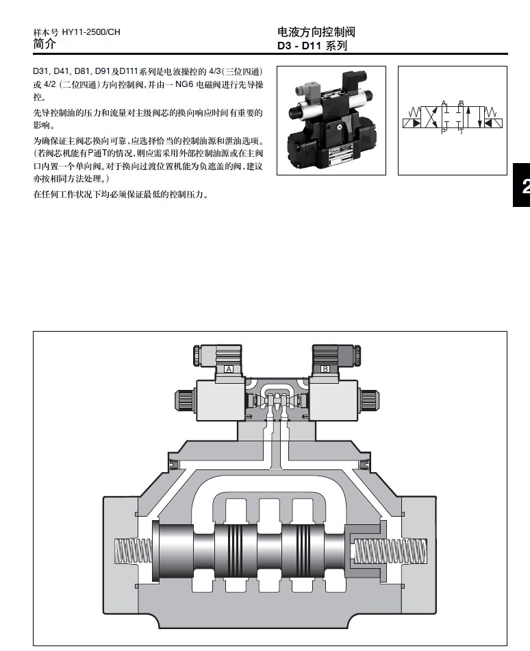 D31 D41 D81 D91和D111系列是电液操控的3位4通或3位4通滑阀式电磁方向阀,并由一NG6电磁阀进行先导控制。先导控制油的压力和流量对主滑动阀芯的换向响应时间有重要的影响。为了保证换向可靠,应选择恰当的的控制油源和泄油选项。
