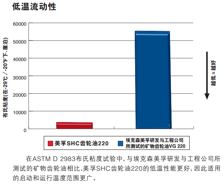 美孚SHC齿轮油系列产品采用先进的添加剂专利技术,设计为工业用齿轮箱提供针对胶合等各种磨损类型的杰 出的耐磨保护,并且具有高级的防微点蚀疲劳性能。此外,与埃克森美孚研发与工程公司所测试的矿物齿轮润滑油 产品相比,美孚SHC齿轮油系列能为齿轮箱的滚动元件轴承提供更好的润滑。美孚SHC齿轮油系列产品具有优秀 的防锈和防腐蚀性能,即使在湿润的环境中也不会有导致精滤清器堵塞的趋势。同时,在高温环境下,美孚SHC齿轮油 系列产品具有优异的黑色金属及有色金属相容性能。